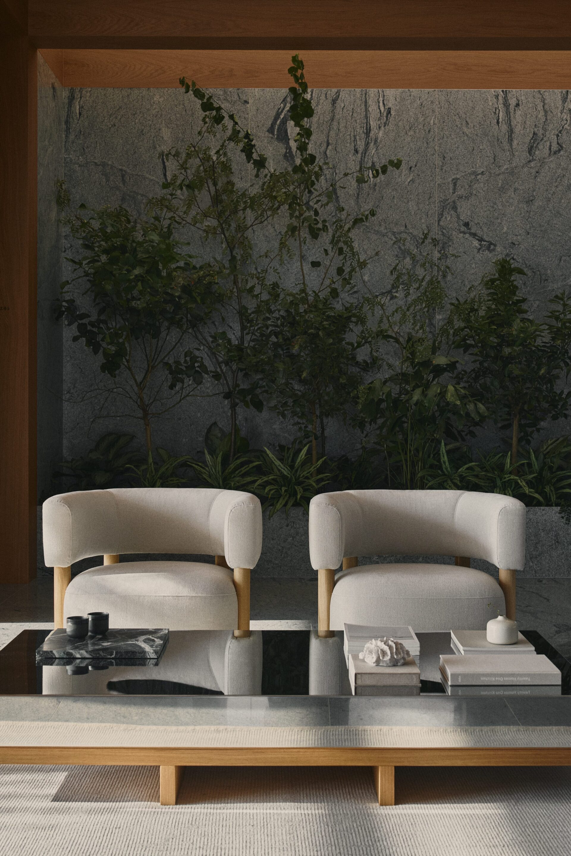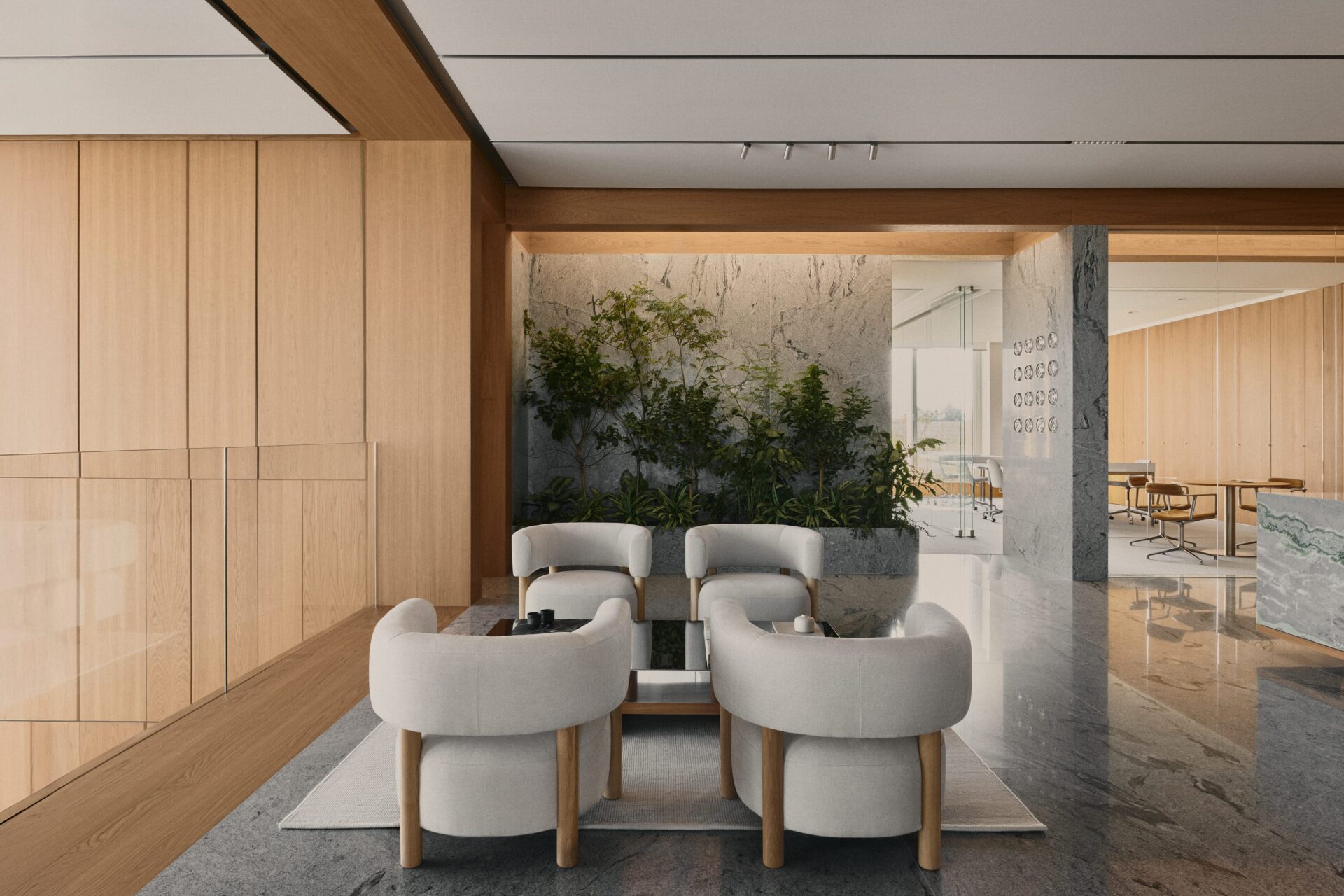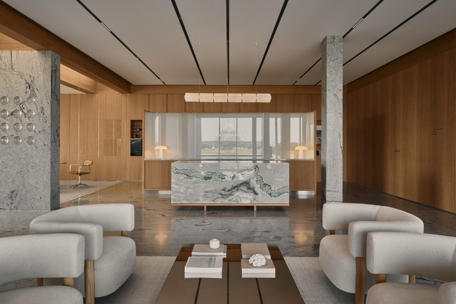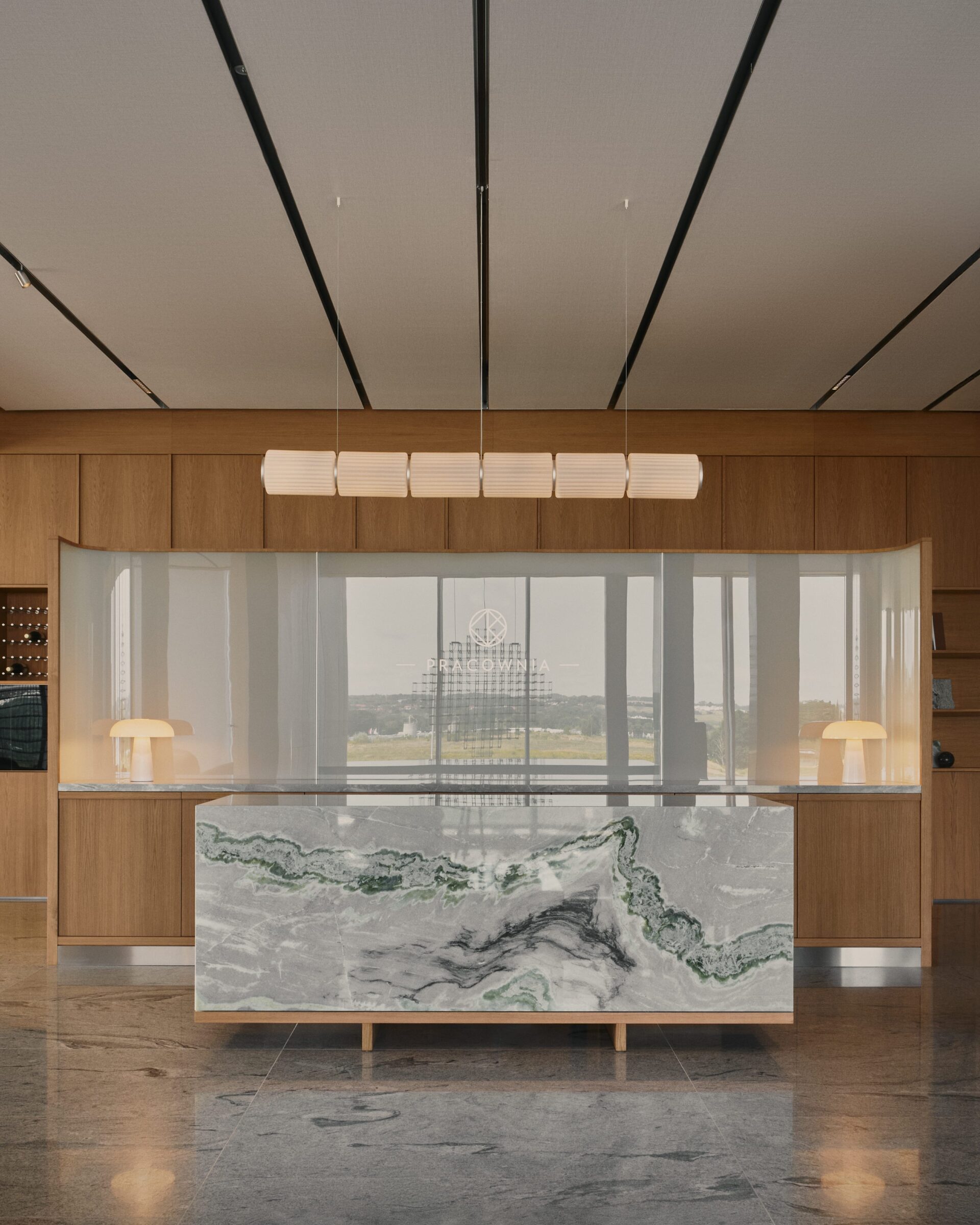 Recepcyjna lada została wykonana z onyksu, którego półprzezroczysta struktura nadaje wnętrzu wyrazisty punkt centralny. Na podłodze ułożono granit o wysokiej odporności na ścieranie, odpowiedni do intensywnie użytkowanych stref wejściowych. Kompozycję dopełniają dębowe wykończenia oraz jasne tekstylia.