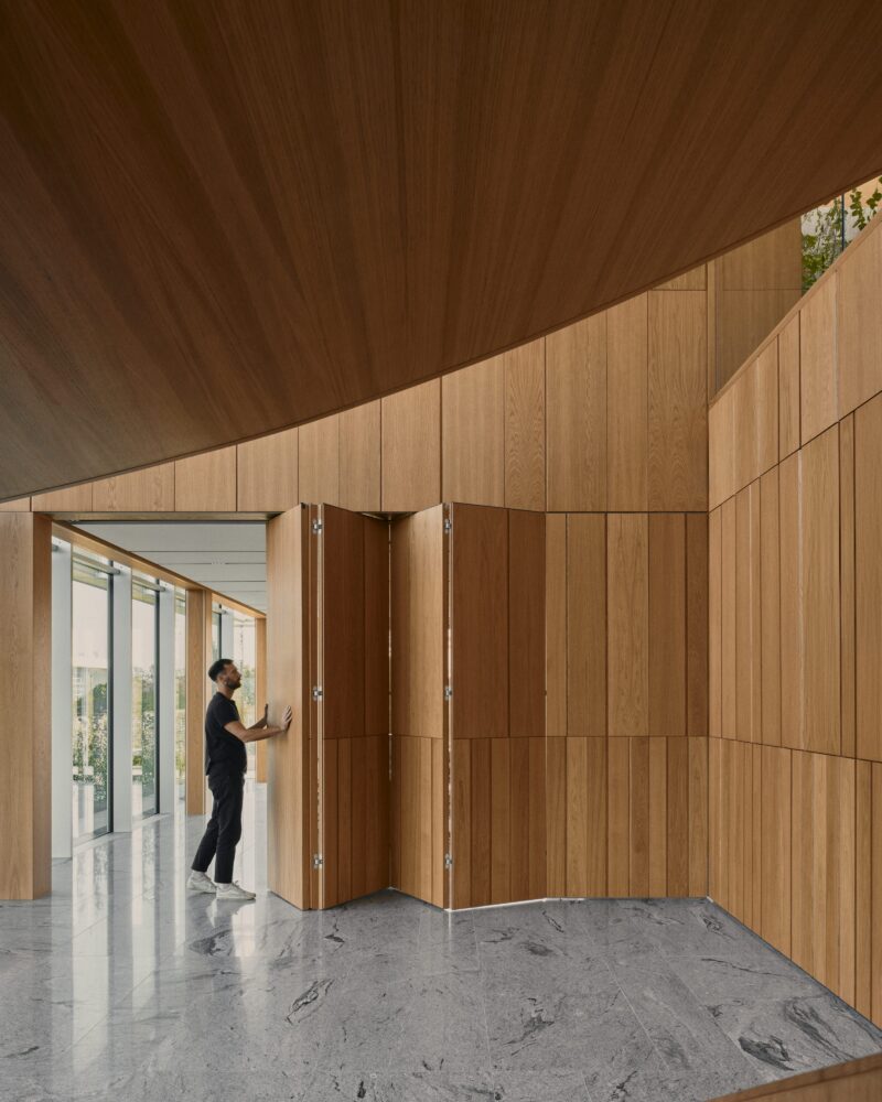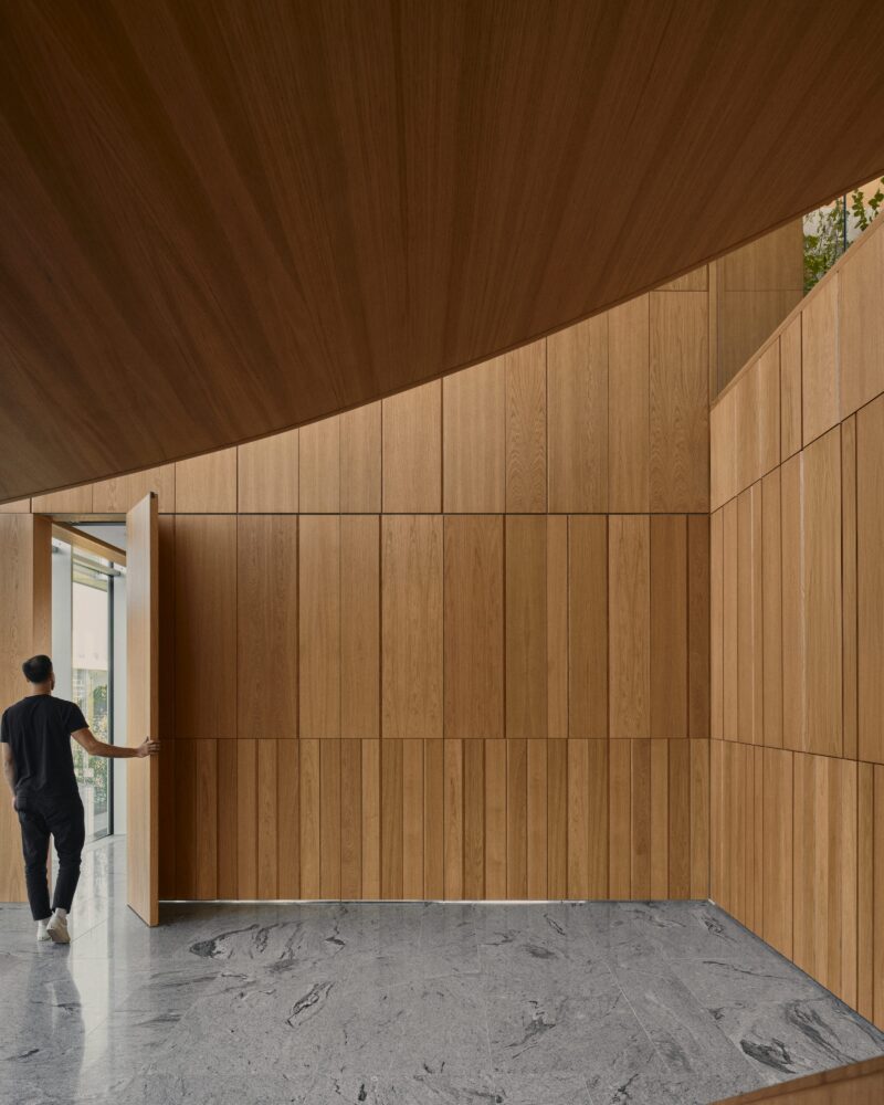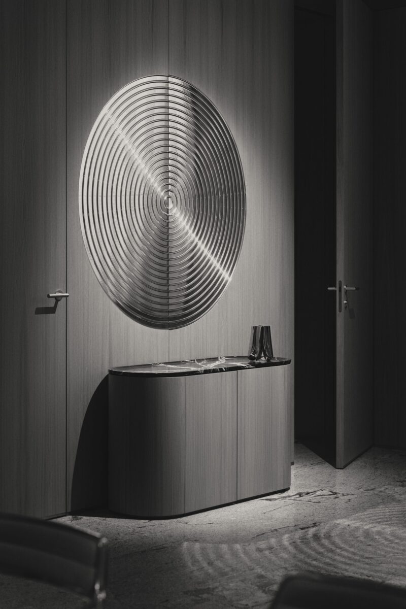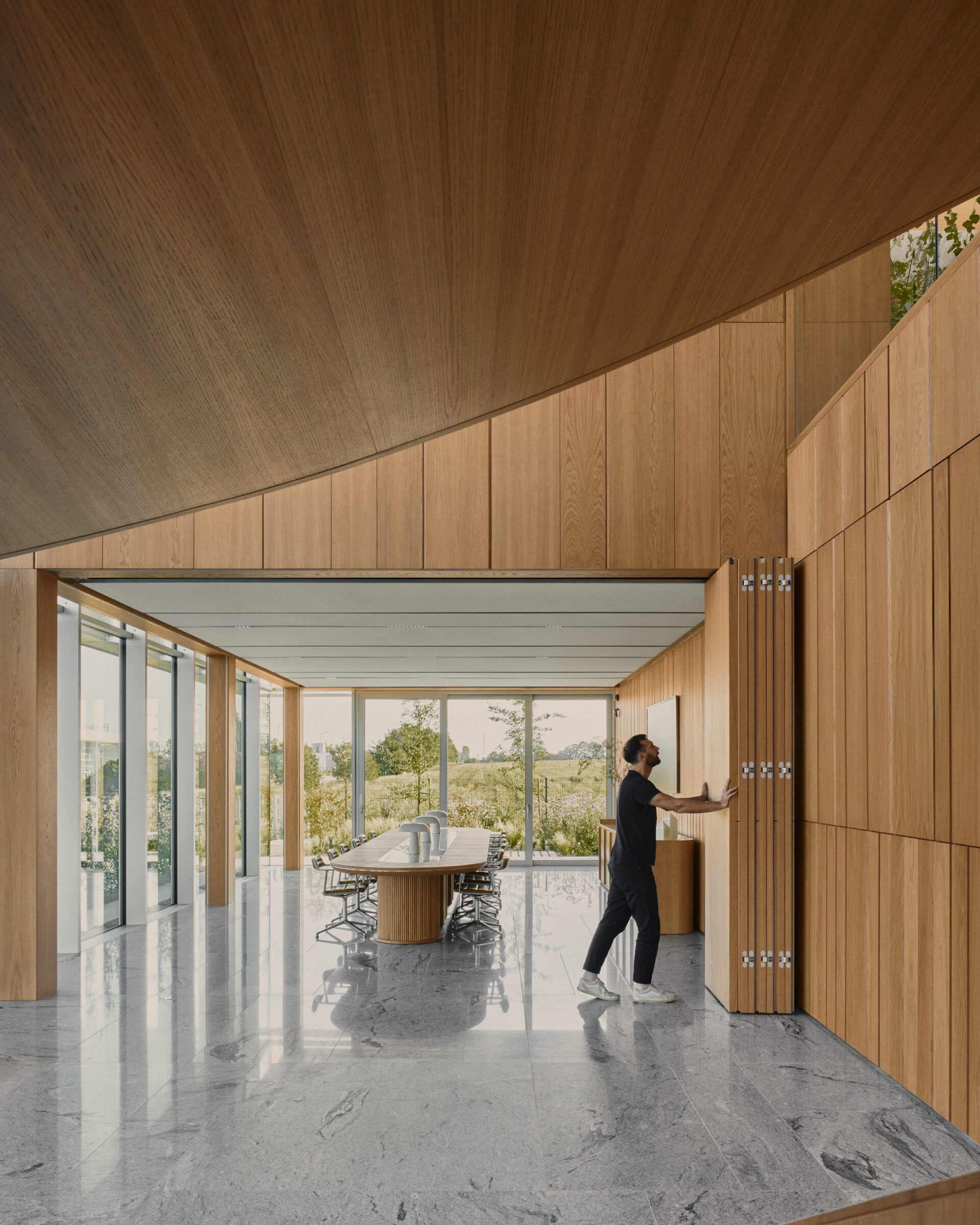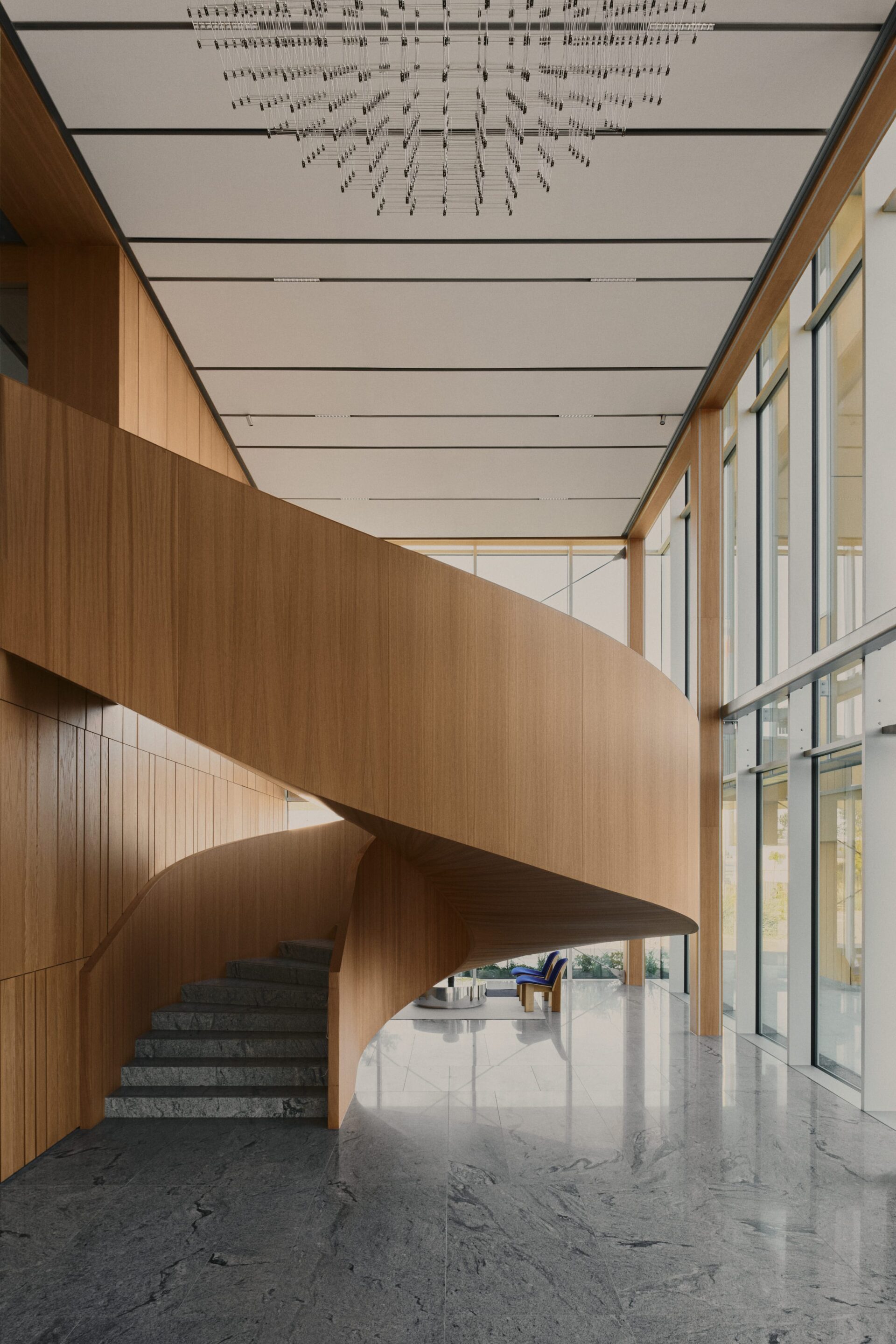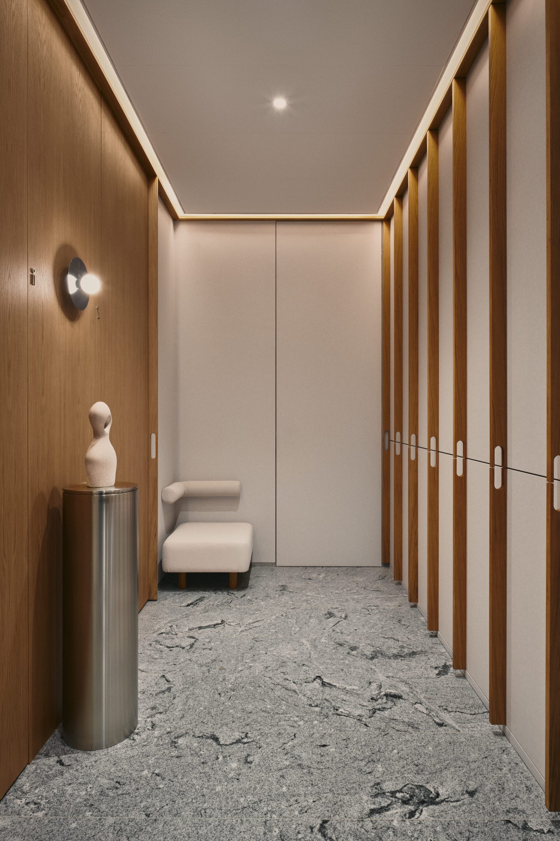 Modularna podłoga z granitu Viscont White rozpościera się na wszystkie pomieszczenia i strefy biurowca pracowni OmniKaiser, tworząc tło dla codziennej pracy. Z tego samego materiału wykonano także schody i okładziny ścienne, dzięki czemu całość zyskała spójność i architektoniczną dyscyplinę.
