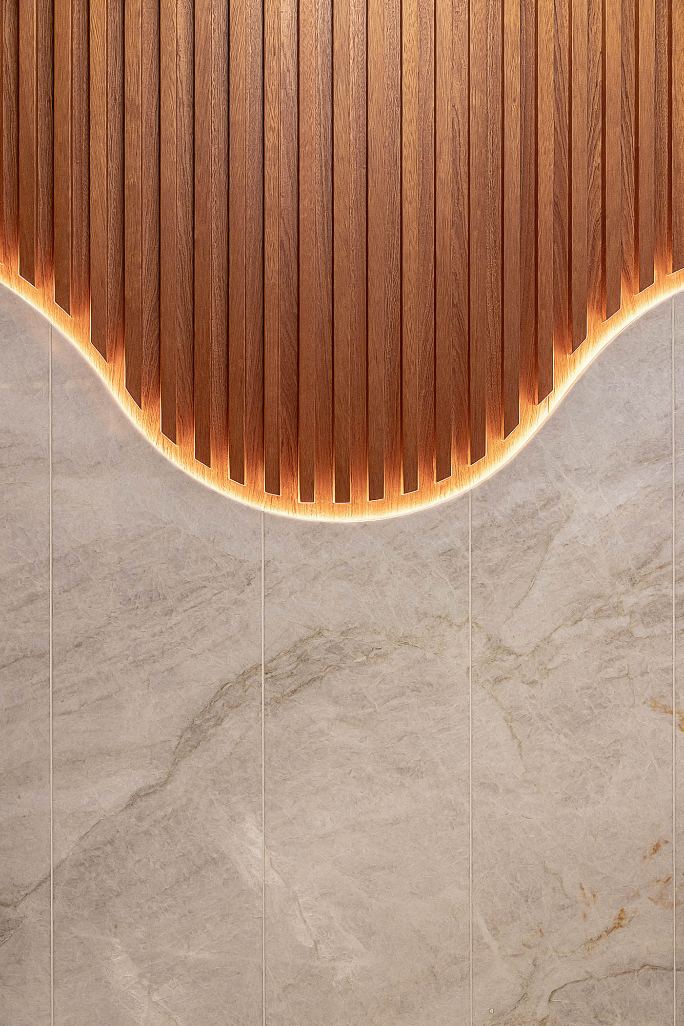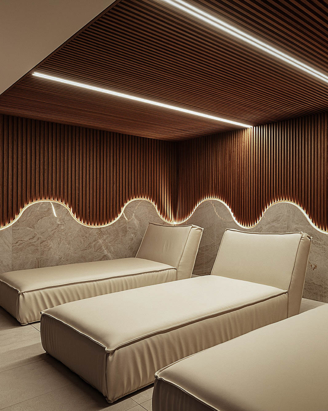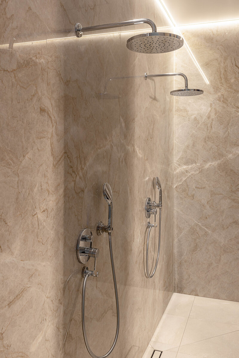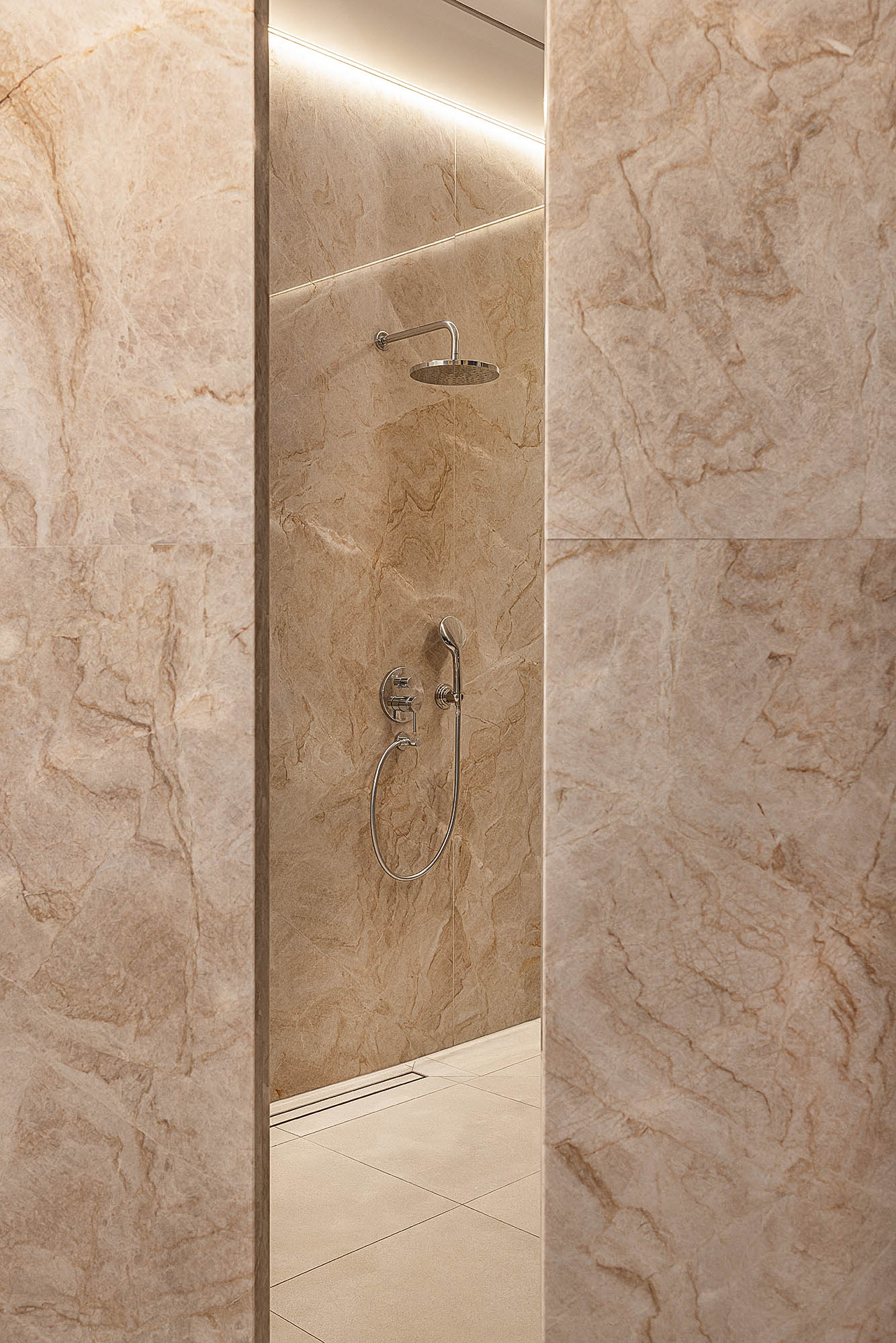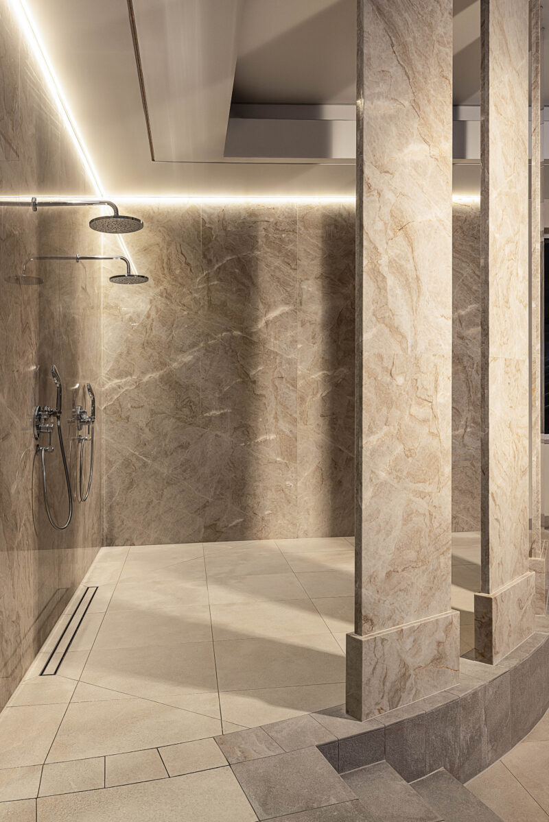 W strefie prysznicowej przy basenie w hotelu Grand Lubicz w Ustce wykorzystaliśmy kwarcyt Taj Mahal. Charakteryzuje się on ciepłym wybarwieniem i odpornością na wilgoć. Jego faktura i kolor tworzą przyjemną, spokojną atmosferę, która doskonale wpisuje się w relaksujący charakter basenu solankowego.